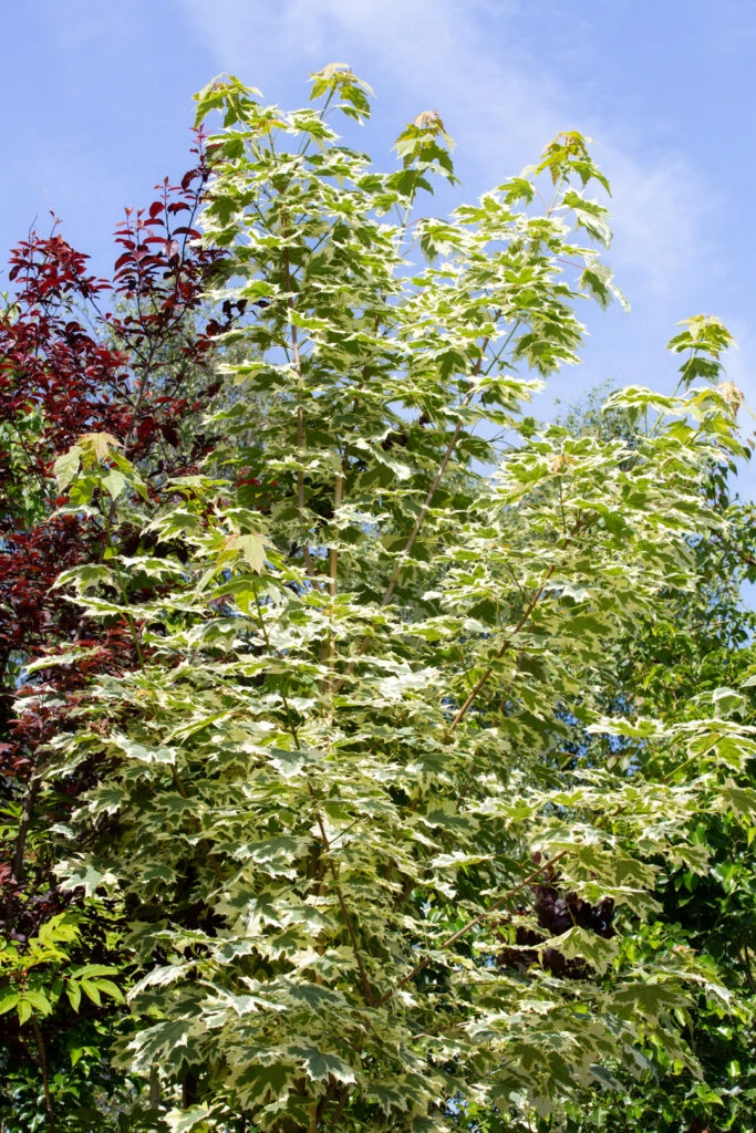 Description: Acer platanoides ‘Drummondii’ is a very popular striking, medium sized garden tree with globe headed green variegated leaves and a striking white marginal band. The foliage turns yellowish orange in the autumn, making it a fantastic seasonal garden tree. In the spring before the leaves emerge, the tree provides attractive yellow flowers. The occasional branch can revert to plain green leaves and should be pruned out. An excellent foil for purple and gold leaved shrubs.