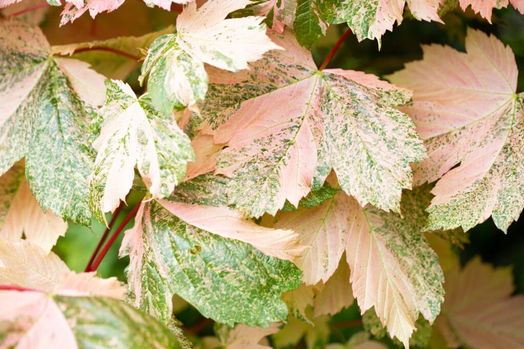 Description: Acer pseudoplatanus ‘Simon-Louis Freres’ is a slow growing, broadly spreading tree with delightful variegated foliage. The leaves are a stunning dusky pink in the spring, becoming green, cream and pink with blotches in the summer. Autumn brings with it golden and bronzed leaf colours. Can be hard pruned to control size and to enhance the spectacular leaves.