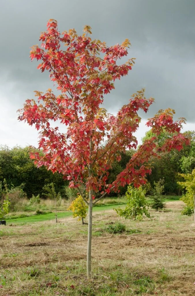 Description: Acer x freemanii ‘Autumn Blaze’ is one of the best varieties for fiery autumn colour. The attractive yellow-green summer foliage turns into a spectacular display of red, orange and yellow autumn colours. In the winter, the bare branches boast silvery-grey bark adding all year round interest. A cross between Acer rubrum x Acer saccharinum. A vigorous hybrid with deeply cut leaves and a dense oval head.