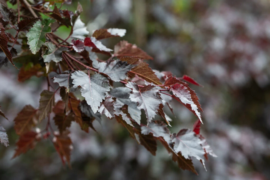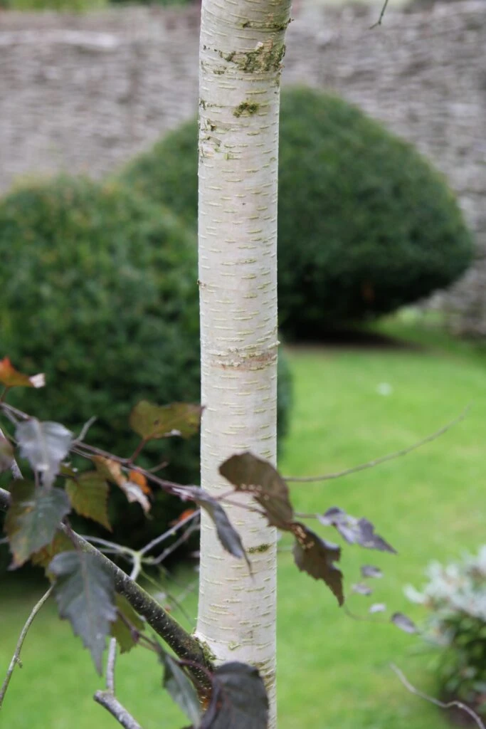 Description: Betula pendula ‘Royal Frost’® is a recent introduction selected for it’s persistent, rich burgundy leaves. The white stemmed bark is complimented with cinnamon hues. Yellow, orange and red colours appear in the autumn providing a stunning, additional feature to this tree. One of the best birch for variety of colour.