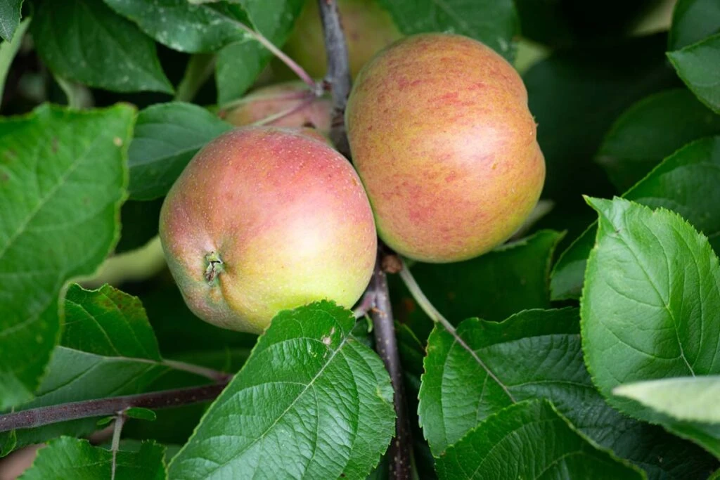 Apple Three Counties: Produces beautiful, golden-flushed cylindrical fruit with crimson flecks and pale spots. Its flavour features a robust astringency that balances sweetness with low acidity. With a strong, upright shape and vigorous growth, it’s perfect for close planting. Regular, heavy harvests in late September.