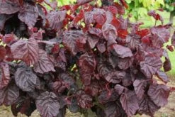 Description: A rare and unusual red leaved form of the contorted twisted stem hazel. This compact, deciduous shrub provides structure and colour throughout the year. Deep plum-purple foliage in early summer, becoming green tinted as the leaves mature, then bright purple in autumn, before falling to reveal an exquisite jumble of curiously twisted stems. Pink/purple catkins decorate the tree in late winter and early spring.