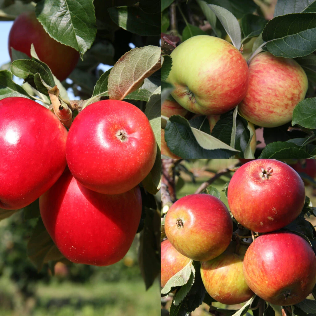 Description: Cox Self Fertile, James Grieve and Katy are grafted onto the same stem to produce a family apple. All of these varieties will cross pollinate each other.