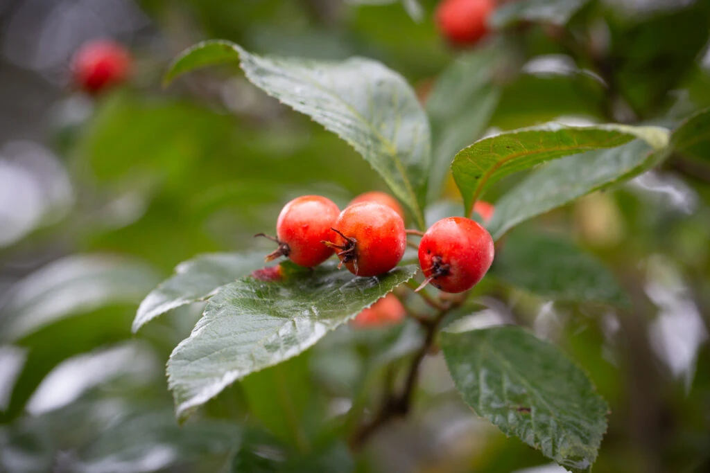Description: A sparingly thorny, deciduous small tree with a dense broad crown and glossy, dark-green, rounded foliage which turns wonderful shades of crimson and bronze in the autumn. White flowers emerge from pink buds in the spring, followed by orange-red haws which ripen in autumn and can persist long into the winter. The bark is also attractive, silvery grey and smooth on the upright twisted branches and then cracking and textured on the trunk and more mature areas. Received the Royal Horticultural Society’s Award of Garden Merit.