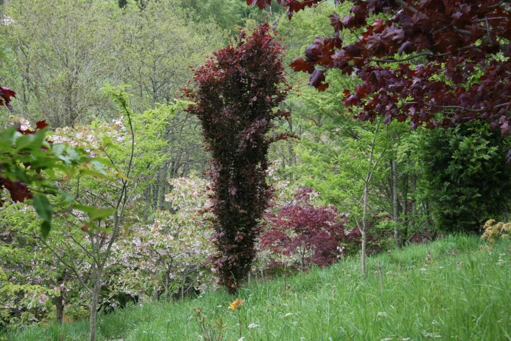 History: In 1969 Director of the Trompenburg Arboretum in the Netherlands, Dick van Hoey Smith, collected Beech nuts from a green-leaved columnar Beech called Dawyck. Out of the one hundred seedlings that he grew, four had purple leaves, and one of these he named Dawyck Purple. Received the Royal Horticultural Society’s Award of Garden Merit.