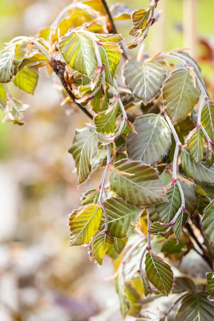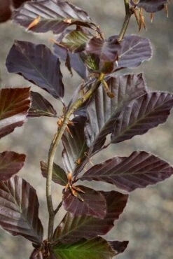 Description: The ‘Dawyck Purple’ beech tree has a stunning columnar shape and is suitable for a smaller garden due to its upright habit. This tree also looks good in larger gardens, particularly when planted with the golden leaved form ‘Dawyck Gold’. ‘Dawyck Purple’ will enchant you with changing foliage throughout the year. In spring, the leaves emerge a radiant burgundy red colour, eventually becoming a deep, dark purple. When the weather turns frosty, the foliage takes on amber tones before dropping to reveal the smooth, grey, muscly bark that Beeches are famous for.