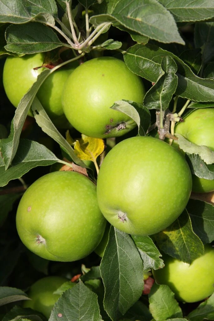 Description: Granny Smith is a well known supermarket variety which is very successful within the commercial orchards. It’s grown extensively in Australia, New Zealand and South Africa where the climate is most suitable. This good keeper needs a long hot summer to perform well. Bright greenish-yellow with smooth, greasy skin and greenish-white, juicy flesh which is refreshing but with no strong taste. Ideal for those who like firm, crisp apples.