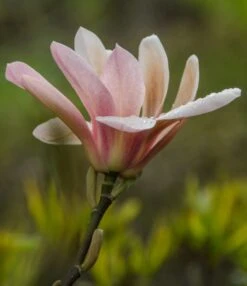 Description: Magnolia ‘Coral Lake’ is a medium sized tree with a spreading habit, produces upright, tulip shaped, peachy pink flowers with vertical yellow stripes, with a pleasant fragrance.