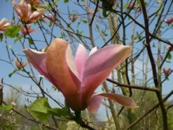 Description: Magnolia ‘Peachy’ is a fast growing medium sized tree, initially upright in habit but spreading with age. The fragrant orange-pink flowers, creamy white on the inside, are quite large, initially tulip shaped but having nine rather floppy tepals that open to 20cm wide as the first leaves are starting to unfurl in late April or early May. The three outer tepals are a distinctive peach colour.