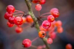Description: A charming, dwarf, upright growing, shrubby, small tree ideal for restricted spaces and patio growing. Dense clusters of waxy white flowers follow dark carmine buds in April, followed by masses of apricot coloured fruits, lasting well into December.