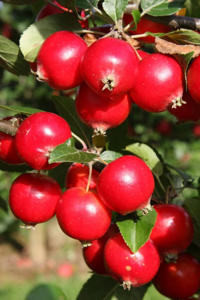Description: An interesting large, red round fruiting form, with white flowers in the spring. Attractive pronounced calyces, just like rosehips, with bright red skin and red flesh. Makes amber crab apple jelly.