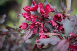 Description: A small, round tree with attractive taper pointed, glossy, dark purple leaves, turning red in autumn. Large purplish crimson flowers, rather hidden in the foliage are followed by dark red fruits.