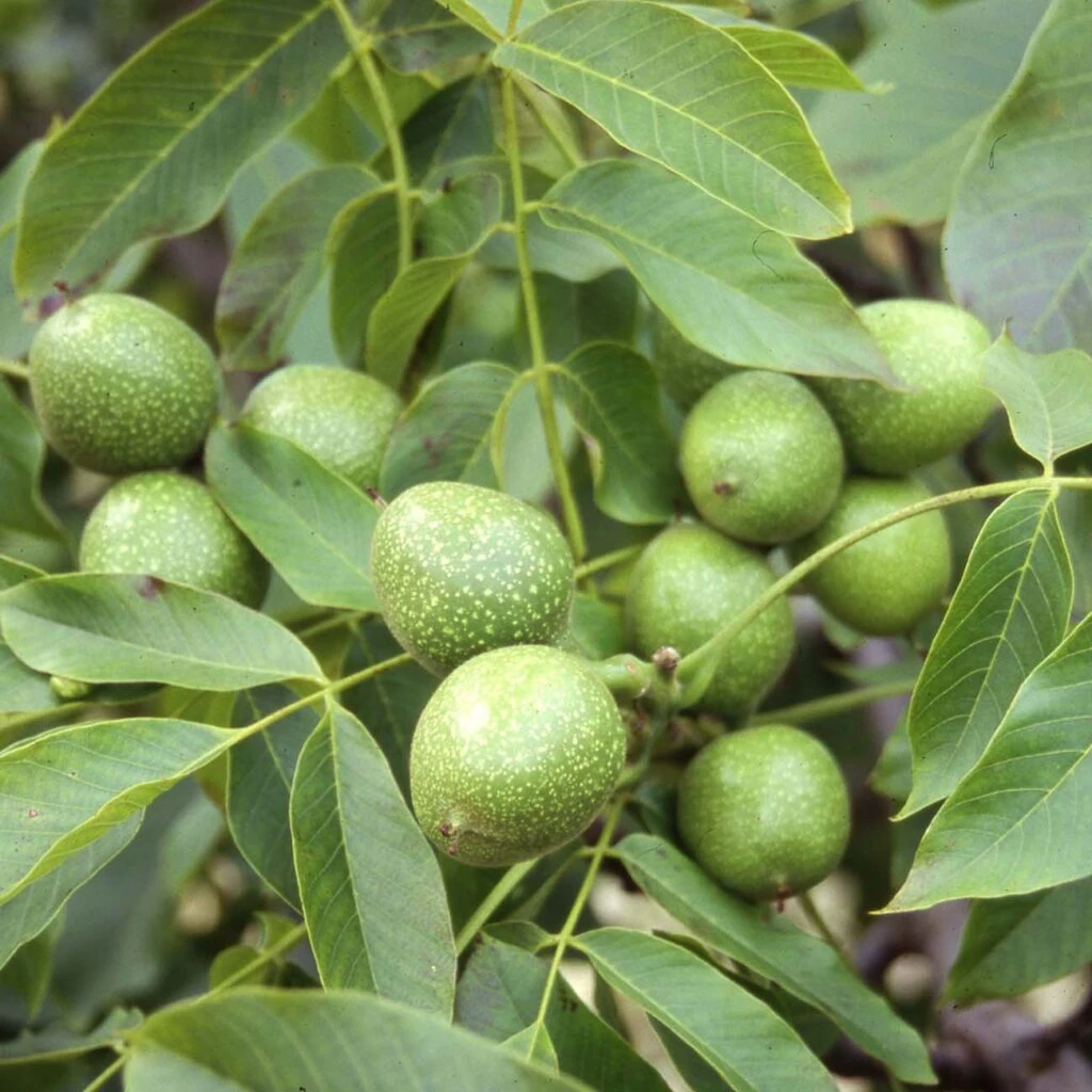 Walnut Growing Tips: Prefer to be planted in full sun or light shade with a sheltered position with no frost pockets. Will tolerate many soil types but are happier in light, sandy, well-drained soils. Walnuts are difficult to establish in the first year of planting and some die-back in the shoot tips is expected. For pickling, the nuts are best picked in July before the shells are formed. Test with a pin or skewer! Rich in antioxidants and omega-3 fatty acids.