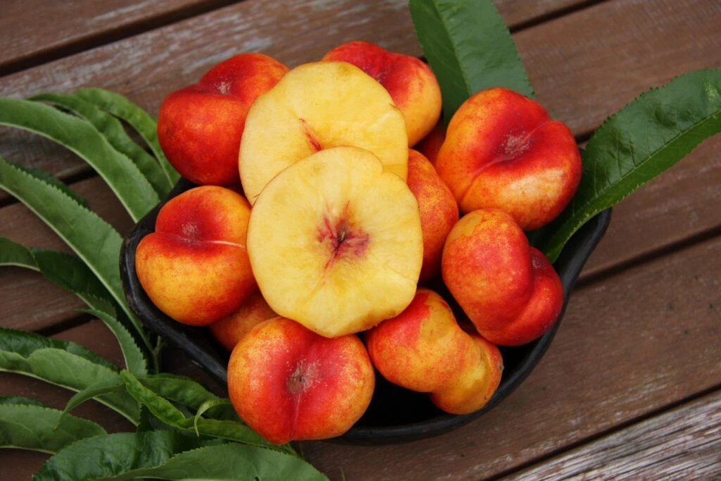 Description: Mesembrine is the sweetest flat nectarine variety. It’s fruits are distinctively flattened and circular, smooth and yellow flushed red with a juicy melting yellow flesh. Perfect sweet flavours making it delicious when it’s eaten from the tree. Clusters of pretty pink flowers appear in the spring. A unique variety that’s relatively new.