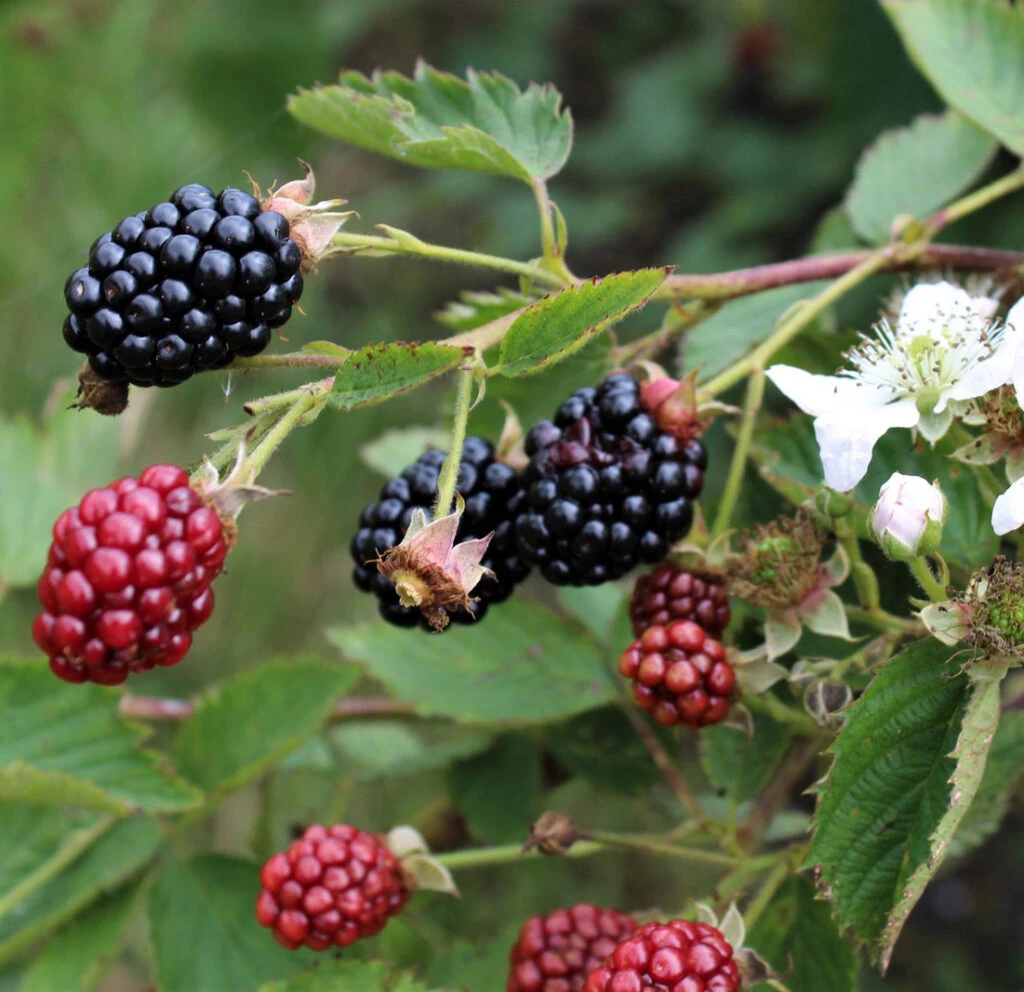 Blackberry Growing Tips: Happier planted in a sunny, sheltered site but they can tolerate light shade. Prefer moisture-retentive but well-drained soil. Blackberries are vigorous and need regular pruning. Tie in the shoots of newly-planted canes. Once they reach their first winter, cut back all sideshoots on the main cains. If you would like to eat the fruits yourself, don’t forget to cover the plant to stop the birds getting them!