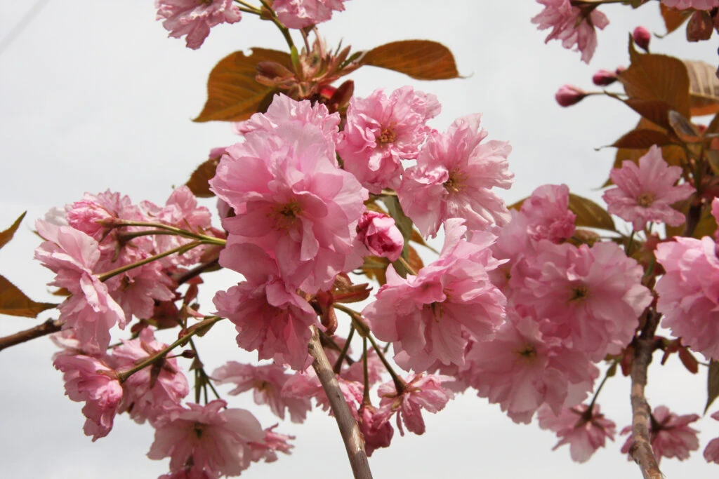 Description: A vigorous wide spreading tree with young bronze foliage, maturing to bright green, then autumn colours of salmon-brown, orange-red and flame. The branches are hidden in spring by the large clusters of semi-double, pale pink, very fragrant flowers.