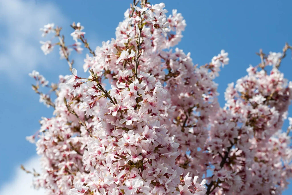 Description: A lovely slender, semi erect, vase shaped tree. Small, shell pink, single flowers open in mid-spring from red buds, before the leaves emerge. A long lived ornamental cherry.