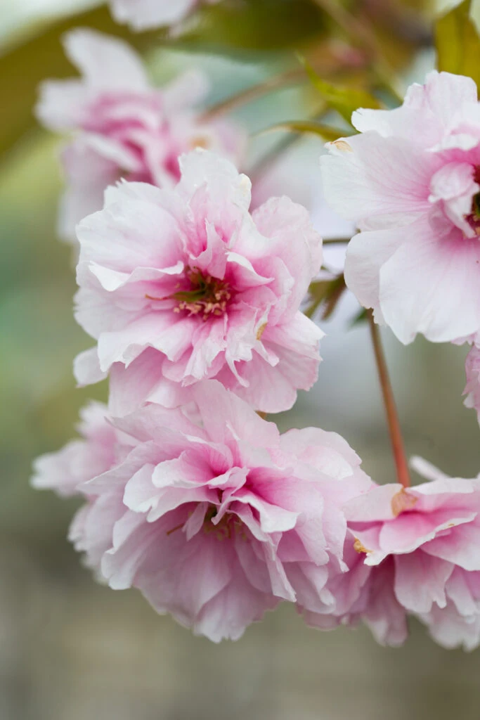 Description: A small vase shaped tree with oval leaves, bronze when young, turning orange-red in autumn. The double, rose pink flowers are one of the most exotic and long lasting of any of the Japanese flowering cherries, persisting for several weeks from early May.