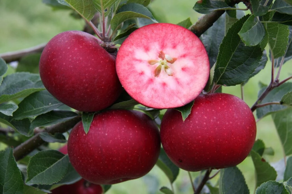 Description: Rosette™ is a new early dessert apple. A lovely bright red apple with an unusual pink speckled ‘rosette’ pattern that penetrates deep into the flesh. The best flavoured pink fleshed apple available, light and sweet flavour with a hint of summer berries. Delicious eaten fresh and produces an attractive tasty apple juice. The tree is compact in habit which makes it ideal for the smallest of gardens. Very heavy cropping and is also easy to grow.