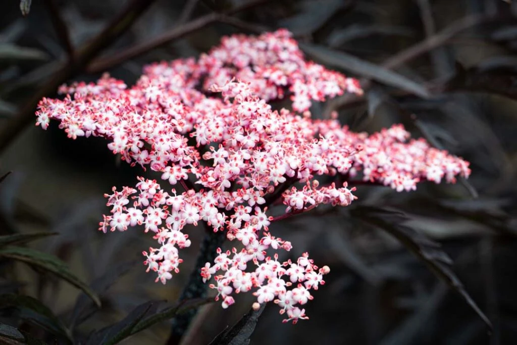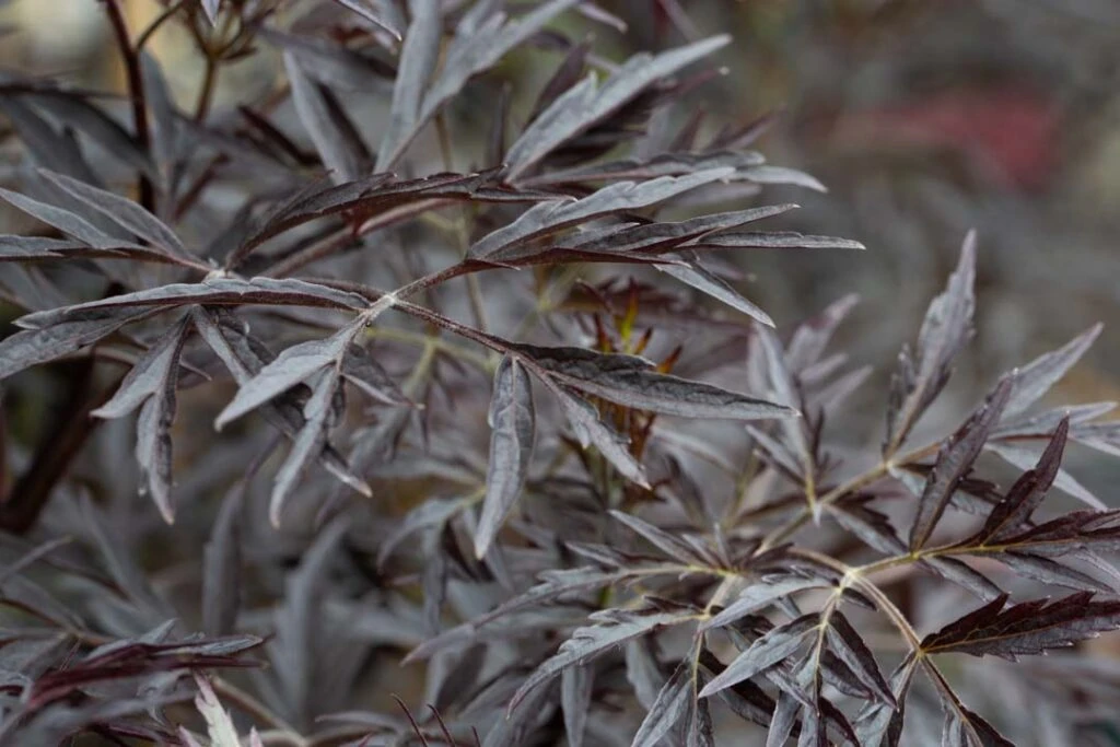 Description: A hardy, deciduous shrub with finely cut, dark burgundy, almost black leaves that turn to vibrant red in autumn. Pretty clusters of tiny pink, scented flowers form at the start of summer, followed by very deep red elderberries.