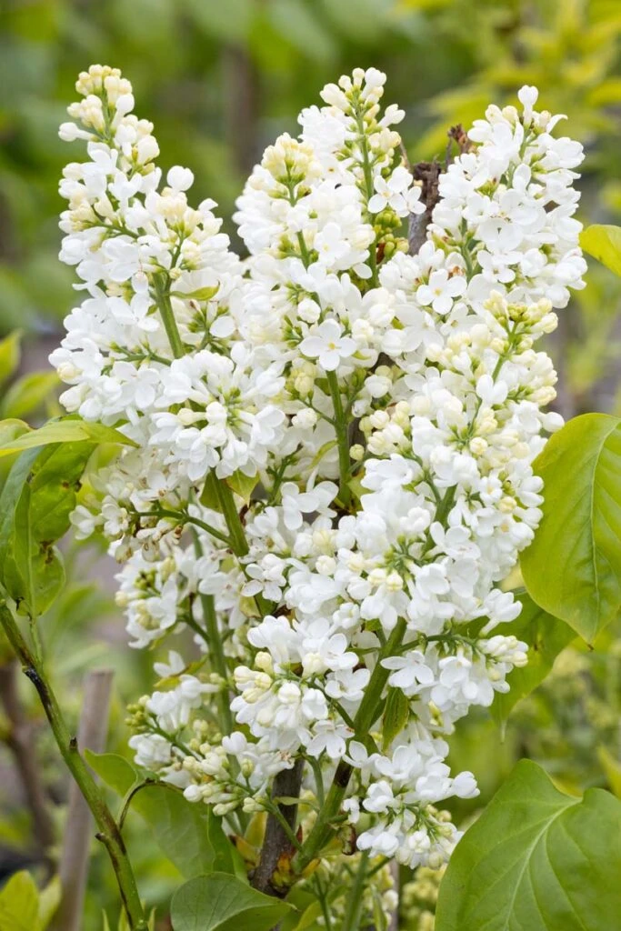 Description: Syringa vulgaris ‘Madame Lemoine’ is a bushy medium sized deciduous shrub with light green, heart shaped leaves. Yellow spring buds open to reveal compact trusses of fragrant, double, white flowers in May-June.