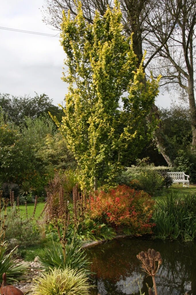 Description: Ulmus x hollandica ‘Wredei’ commonly known as Upright Golden Elm is a deciduous upright tree with a conical habit when young, forming a more rounded tree with age. Broad crinkled edged leaves are bright yellow where exposed to the sun and greener in the shaded parts giving a suffused appearance, adopting rich shades of gold in the autumn.